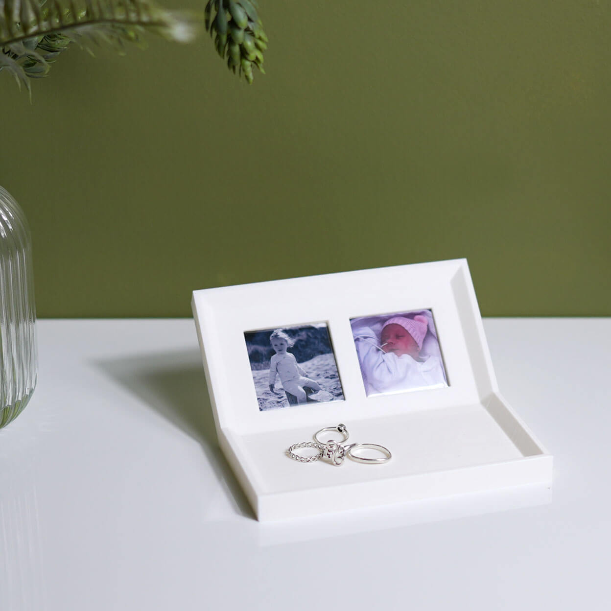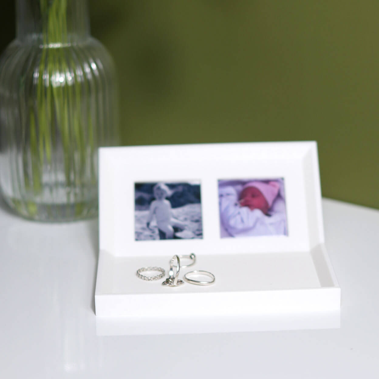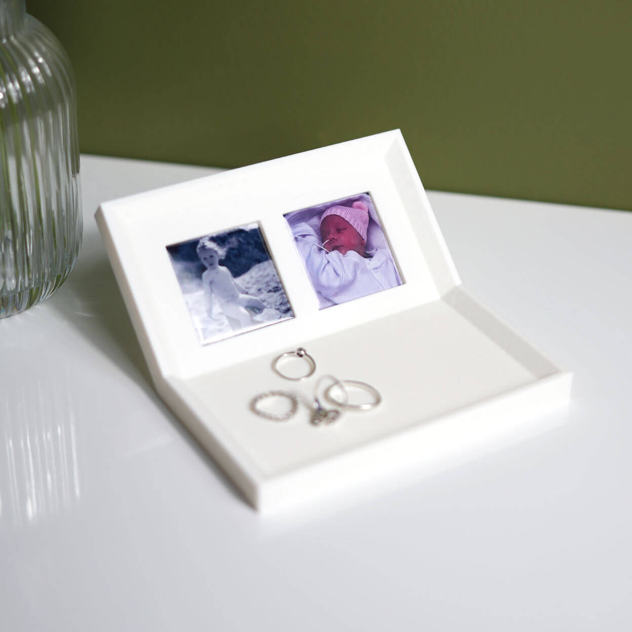 This trinket tray features an angled design with two photo magnets in view above a spacious tray, useful for holding jewelry, coins, keys and other trinkets.